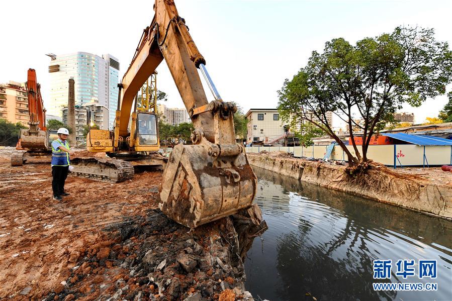 福建省福州市鼓台中心区水系综合治理点达道河河长温水林在指挥工人进行河道新建截污管的回填(2017年10月11日摄)。