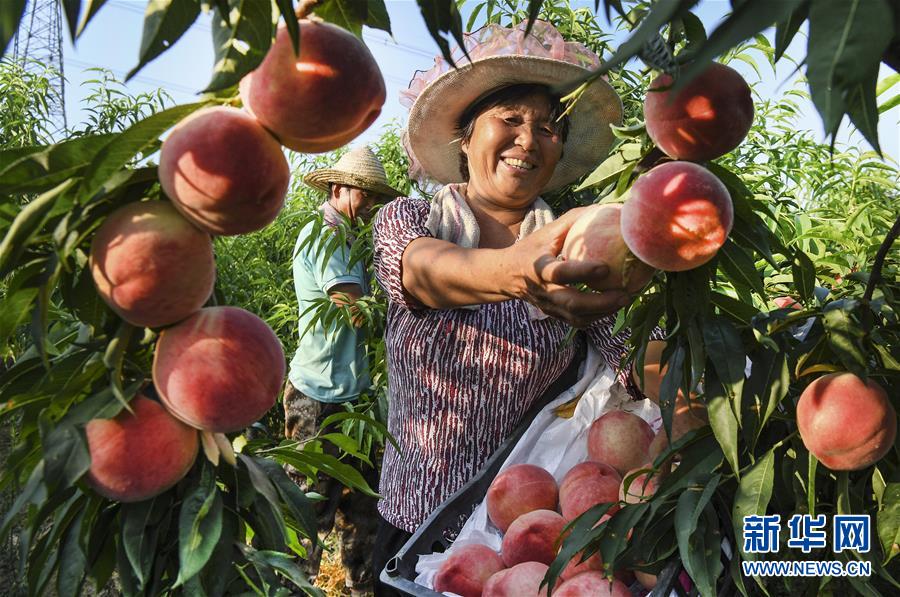 7月17日,陕西省渭南市华州区下庙镇甘村村民毛翠云(前)在本村的大圣桃缘农业发展有限公司摘桃。为了带动全村的产业发展,该公司免费为全村农民的3000亩桃园提供新品种接穗和技术辅导。目前,全村的桃业年收入超过亿元。 陕西省渭南市华州区在扶贫工作中,充分发挥当地农业示范重点龙头企业的模范带动作用,2018年以来,已组织开展农业产业技术集中培训38场,培训人数2125人次;落实产业扶贫项目56个,发展农民专业合作社488个、家庭农场138个,共带动6346个贫困户发展产业,使新型经营主体成为当地农业产业发展的领头羊和主力军。 新华社记者陶明摄