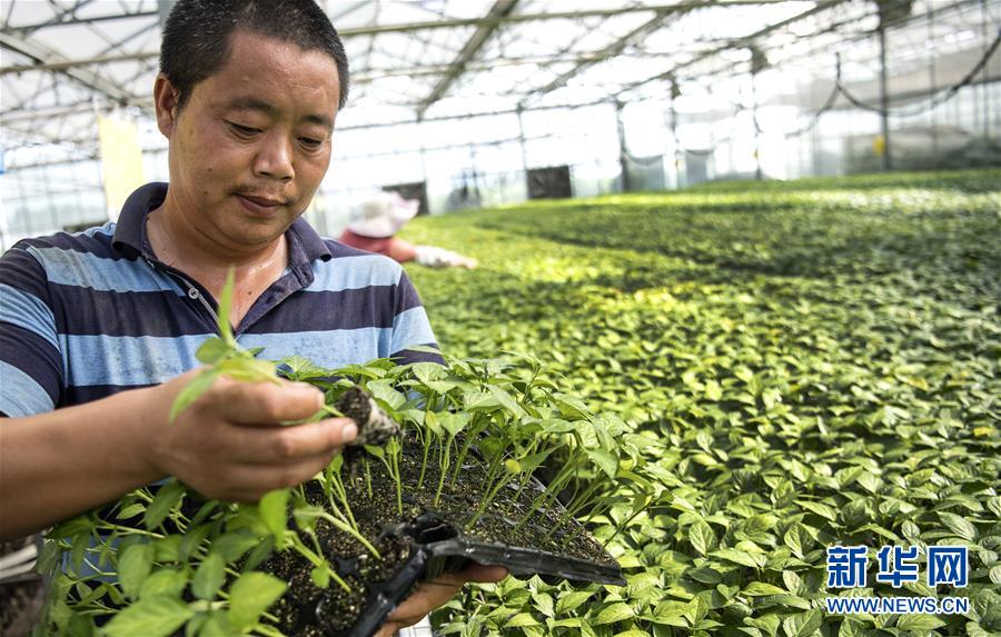 7月17日,陕西省渭南市华州区柳枝镇钟张村王纪华在查看育苗工厂内的青椒苗。2014年被认定为贫困户的王纪华一家4口人,家庭年收入不足1500元。当地政府将他安排在本村的农业示范企业务工,因管理与技术过硬,2017年8月开始,他承包了40个产业大棚的管理与技术辅导,目前的家庭年收入已超过10万元。 陕西省渭南市华州区在扶贫工作中,充分发挥当地农业示范重点龙头企业的模范带动作用,2018年以来,已组织开展农业产业技术集中培训38场,培训人数2125人次;落实产业扶贫项目56个,发展农民专业合作社488个、家庭农场138个,共带动6346个贫困户发展产业,使新型经营主体成为当地农业产业发展的领头羊和主力军。 新华社记者陶明摄