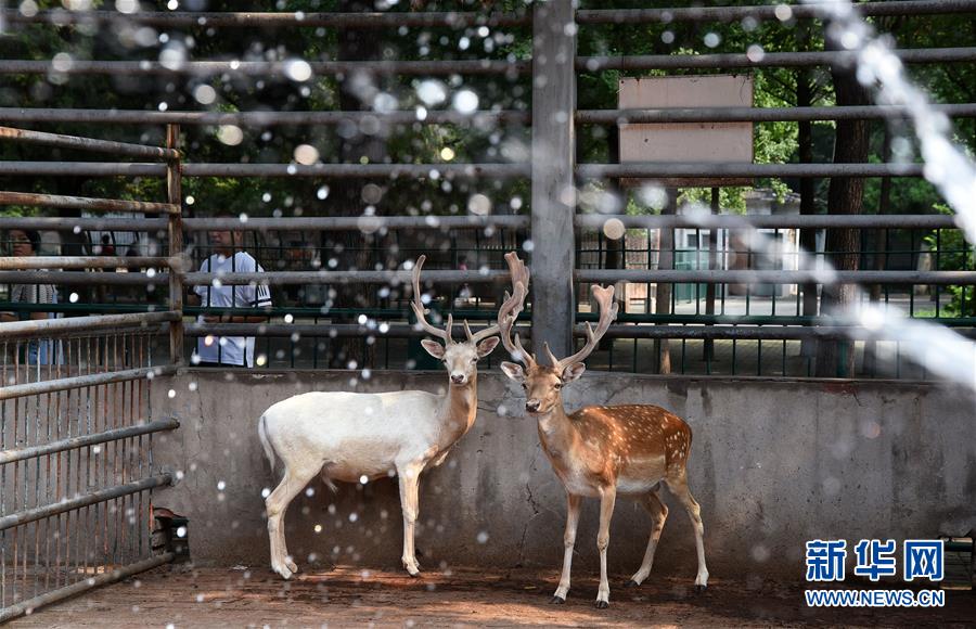 7月18日,河北省邯郸市动物园里的黇鹿在喷淋冲凉。