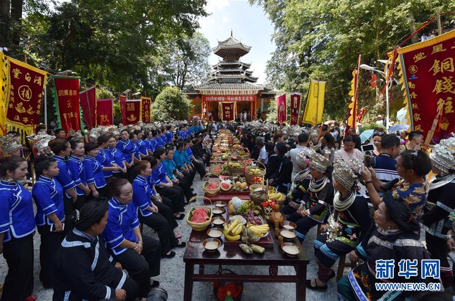 7月18日,锦屏县彦洞乡瑶白村村民身着盛装围坐在长桌宴旁。 当日是农历六月初六,贵州省锦屏县彦洞乡瑶白村村民身着盛装,汇聚于寨中的戏楼前,摆起长桌盛宴,举办摆古活动,欢庆“六月六”。摆古是一种反映该地区侗族迁徙历史的口头文学,是融歌、舞、戏、演说等表演艺术于一体的民俗盛会。 新华社发(陈礼杏 摄)