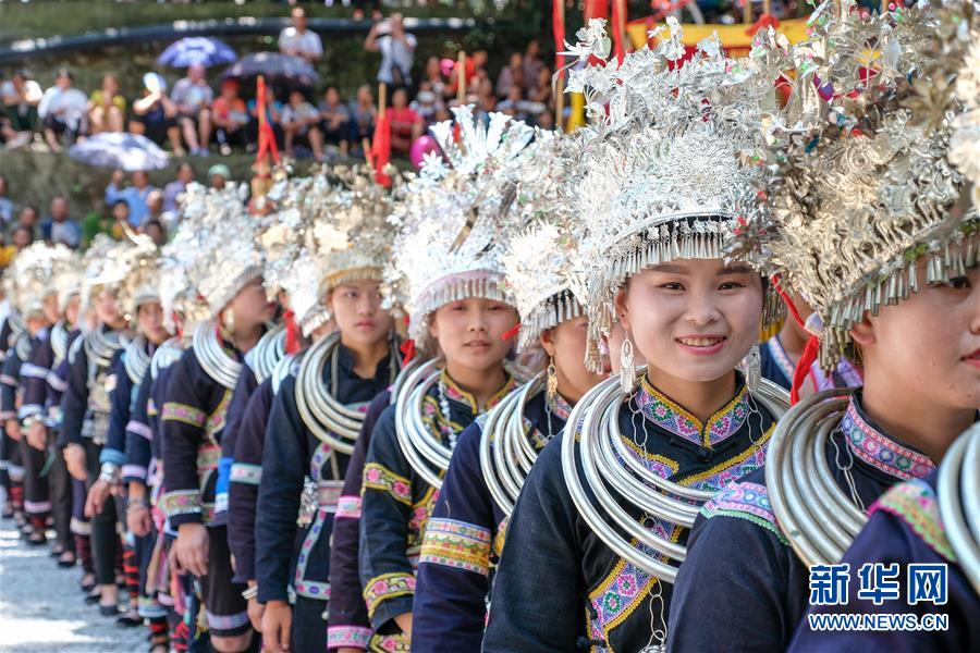 7月18日,锦屏县彦洞乡瑶白村村民身着盛装参加“六月六”活动。 当日是农历六月初六,贵州省锦屏县彦洞乡瑶白村村民身着盛装,汇聚于寨中的戏楼前,摆起长桌盛宴,举办摆古活动,欢庆“六月六”。摆古是一种反映该地区侗族迁徙历史的口头文学,是融歌、舞、戏、演说等表演艺术于一体的民俗盛会。 新华社发(彭泽良 摄)