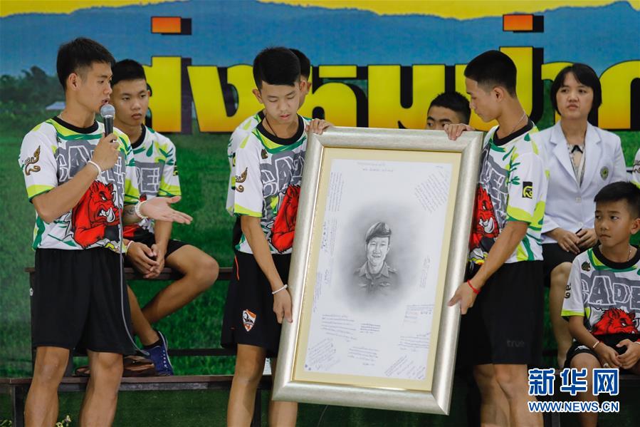 7月18日,在泰国清莱,从被困山洞中获救的少年足球队员捧着在救援行动中牺牲的泰国海军前士兵的肖像。 新华社发