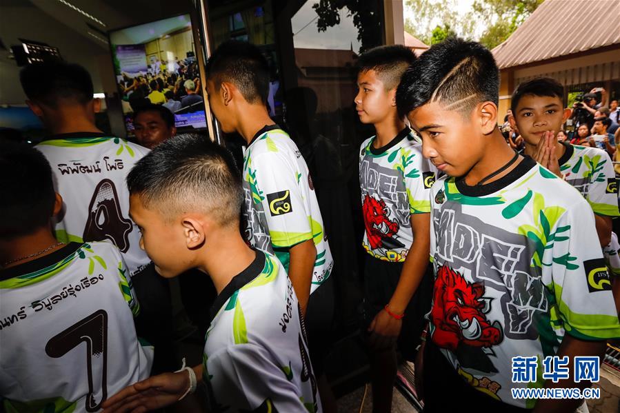 7月18日,在泰国清莱,从被困山洞中获救的少年足球队员准备参加新闻发布会。 新华社发