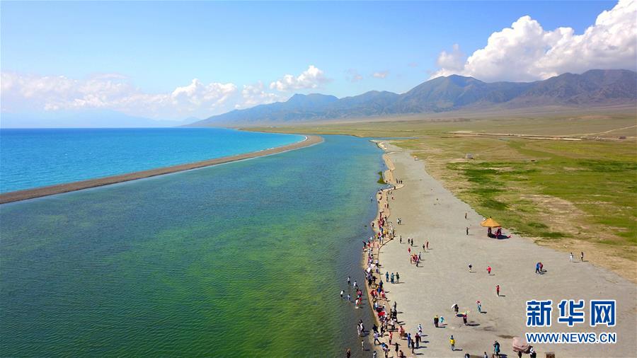 7月18日,游客在新疆赛里木湖观光游览(无人机拍摄)。 新华社发(许丛军 摄)