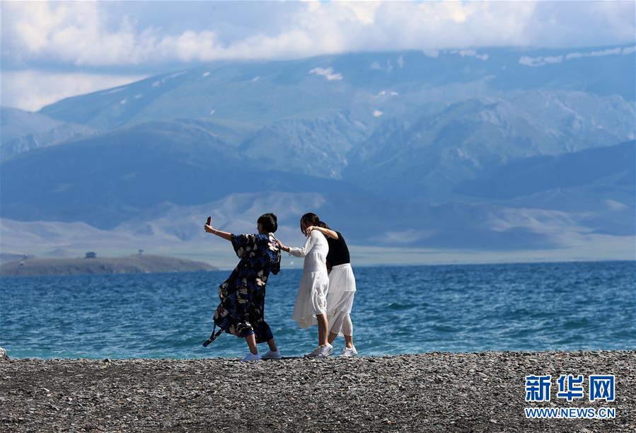7月18日,游客在新疆赛里木湖湖畔留影。 新华社发(许丛军 摄)