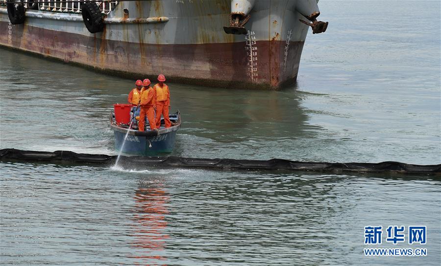 7月21日,在马村港海南中油深南能源有限公司LNG码头演习现场,工作人员使用消油剂处理现场。