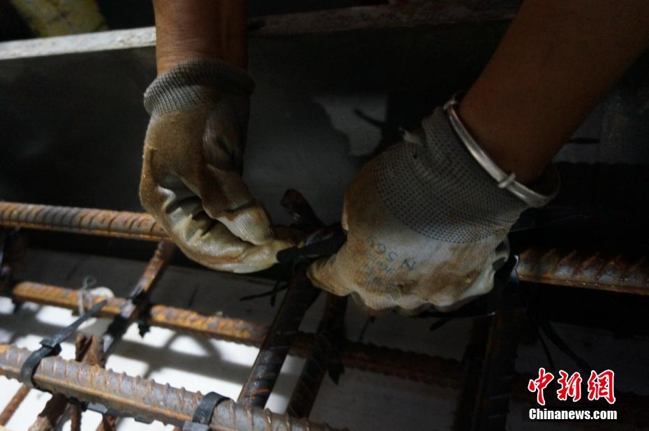 从晚上7点到第二天上午10点,郑万高铁颍河特大桥施工不间断,各个工种有序衔接。图为一名女工的双手沾满油污。 韩章云 摄