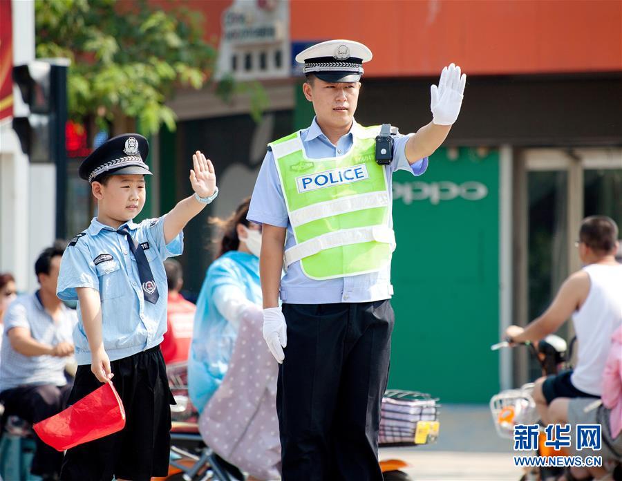 7月21日,“小交警”在民警的指导下体验指挥交通。 暑假期间,河北省武邑县公安交警大队组织小学生开展“小交警文明行 暑期安全记心间”主题实践活动。学生们通过学习交通手势操、识别交通标识和现场体验道路指挥等活动,提升暑期交通安全意识。 新华社记者 朱旭东 摄
