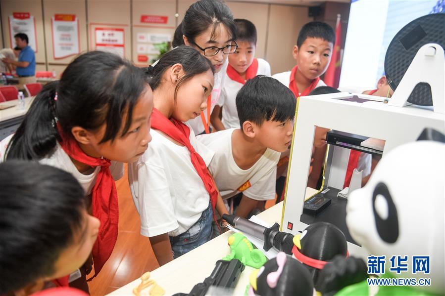 7月21日,志愿者在合肥市万年埠街道云华社区活动中心向留守儿童介绍3D打印技术。 当日,安徽省合肥市万年埠街道开设以“情暖童心 放飞梦想”为主题的暑期科技小课堂,邀请来自安徽寿县窑口小学的留守儿童与志愿者一起感受科技魅力。 新华社记者 张端 摄