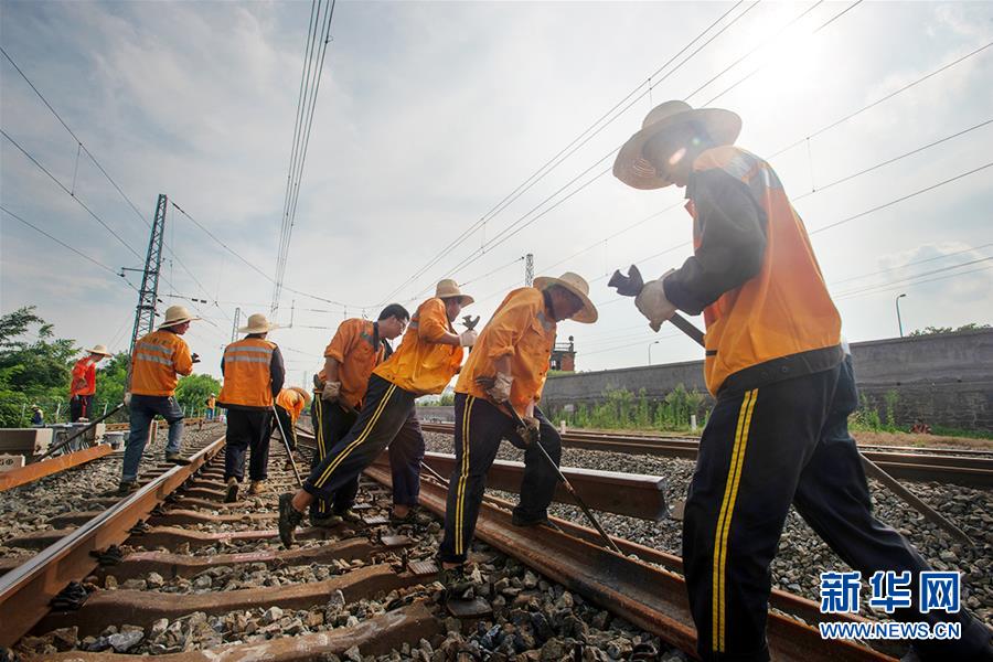 7月17日,铁路工人在湖北荆门漳河站进行钢轨更换作业。 烈日炎炎,热浪袭人。高温之下,劳动者坚守在各自的工作岗位,用奉献和汗水诠释着奋斗的意义。 新华社发(彭琦 摄)