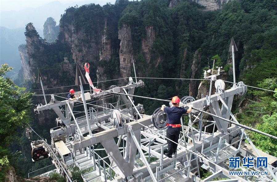 7月18日,湖南张家界武陵源风景区天子山索道检修工人冒着高温在索道支架上巡检设备(无人机拍摄)。 烈日炎炎,热浪袭人。高温之下,劳动者坚守在各自的工作岗位,用奉献和汗水诠释着奋斗的意义。 新华社发(吴勇兵 摄)
