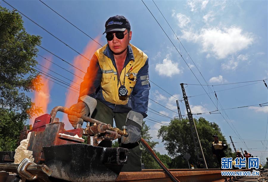 在沈阳裕国火车站,沈阳工务段开原综合维修车间焊轨工在高温下进行焊轨作业(7月10日摄)。 烈日炎炎,热浪袭人。高温之下,劳动者坚守在各自的工作岗位,用奉献和汗水诠释着奋斗的意义。 新华社记者杨青摄