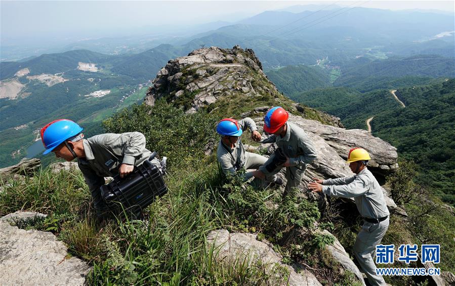 湖北省孝感供电公司的高压线路运维人员沿着湖北省孝昌县大悟山110千伏凤界线输电线路进行巡查(7月18日摄)。 烈日炎炎,热浪袭人。高温之下,劳动者坚守在各自的工作岗位,用奉献和汗水诠释着奋斗的意义。 新华社记者程敏摄