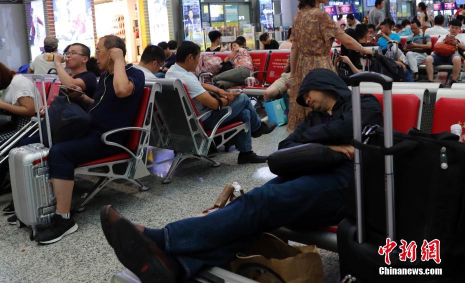 7月22日,部分旅客滞留在上海虹桥火车站。当日,为了应对台风“安比”,上海停运多趟高铁列车。上海市气象局22日早间发布,今年第10号台风“安比”将以每小时25公里左右的速度向西北方向移动,预计今天中午前后在上海登陆。 中新社记者 汤彦俊 摄