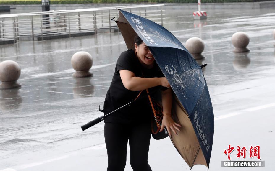 7月22日,一名路人试图用雨伞抵御狂风。当日,受台风“安比”影响,上海局部出现狂风暴雨。 中新社记者 汤彦俊 摄