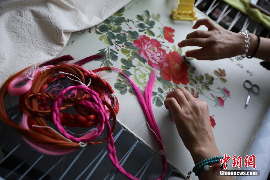 7月22日,江苏盐城东台民间艺人制作发绣作品。东台发绣是一门千年流传的独门技艺,是以人的发丝为材料,以钩针作画笔,利用头发黑白灰黄自然色泽,用接切缠滚针法,在布帛上施针度线,创造形象的艺术品。泱波 摄