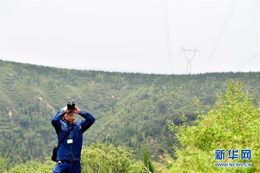 7月24日,在河南省新密市牛店镇花家店村,张长栓在用望远镜瞭望巡查。 盛夏时节,用电负荷攀升,各地巡线工人坚守在工作一线,保障用电安全。 “90后”吴俊鹏是国家电网郑州供电公司输电运检室一名普通巡线工,他和师傅——有着33年工作经验的老“蜘蛛侠”张长栓一起,每日冒着酷暑攀爬高压输电铁塔巡视检查。吴俊鹏说:“虽然辛苦,但通过努力保障社会正常用电,我感觉特别值得。” 新华社记者 冯大鹏 摄