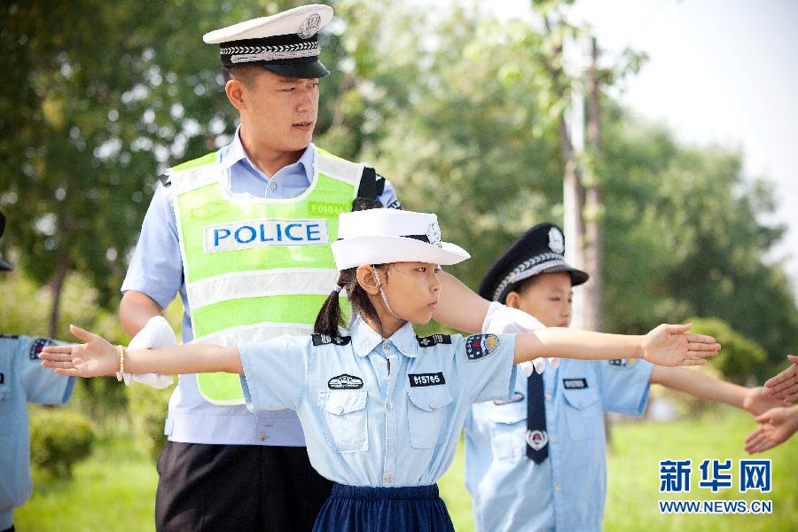 暑假期间,河北省武邑县公安交警大队组织小学生开展“小交警文明行 暑期安全记心间”主题实践活动。学生们通过学习交通手势操、识别交通标识和现场体验道路指挥等活动,提升暑期交通安全意识。新华社记者 朱旭东 摄
