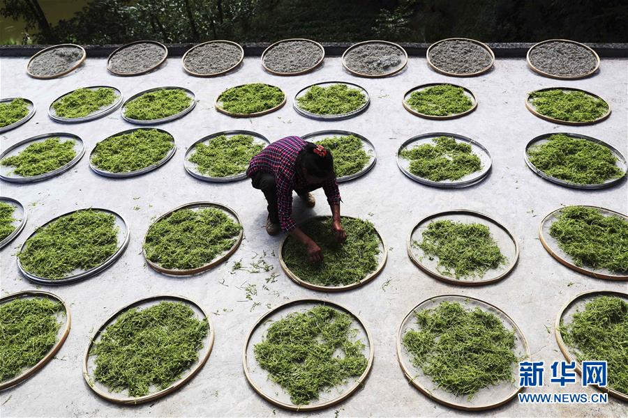 7月24日,村民在藤茶基地进行分拣工作。 近年来,重庆市黔江区邻鄂镇大力发展生态农业,把一种叫“显齿蛇葡萄”的植物的藤蔓茎叶加工成藤茶产品,作为促农增收的产业来发展。邻鄂镇通过土地流转建起了1000亩藤茶基地,每亩年产值可达8000多元,带动当地农民致富增收。 新华社发(杨敏 摄)