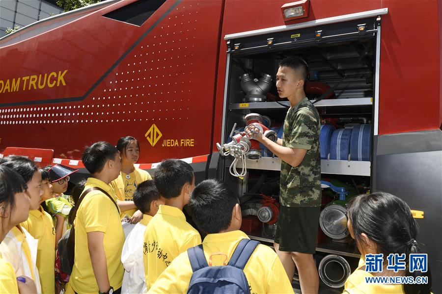 7月27日,消防员在向小朋友讲解消防车上的设备使用。