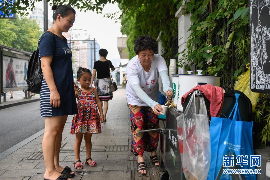 7月29日,志愿者卞阿姨为路人提供凉茶。 新华社记者 黄宗治 摄