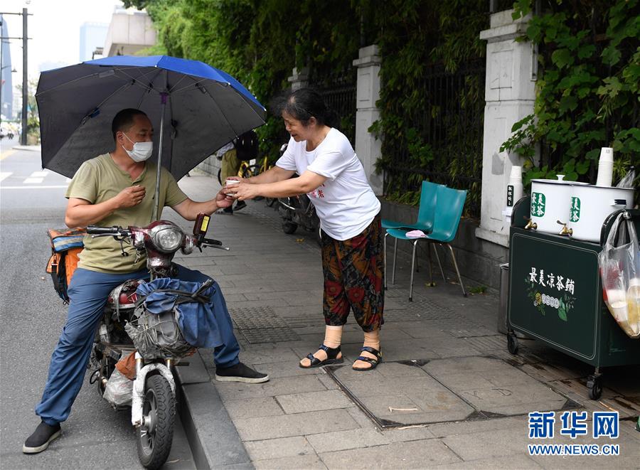 7月29日,志愿者为一位经过的外卖配送员递上凉茶。 新华社记者 黄宗治 摄