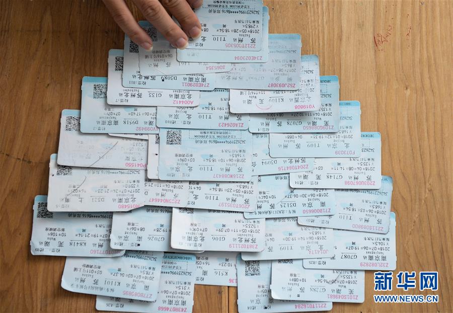 郑勇涛展示部分以前来苏州看龚雪娟的往返火车票(7月21日摄)。 新华社记者季春鹏摄