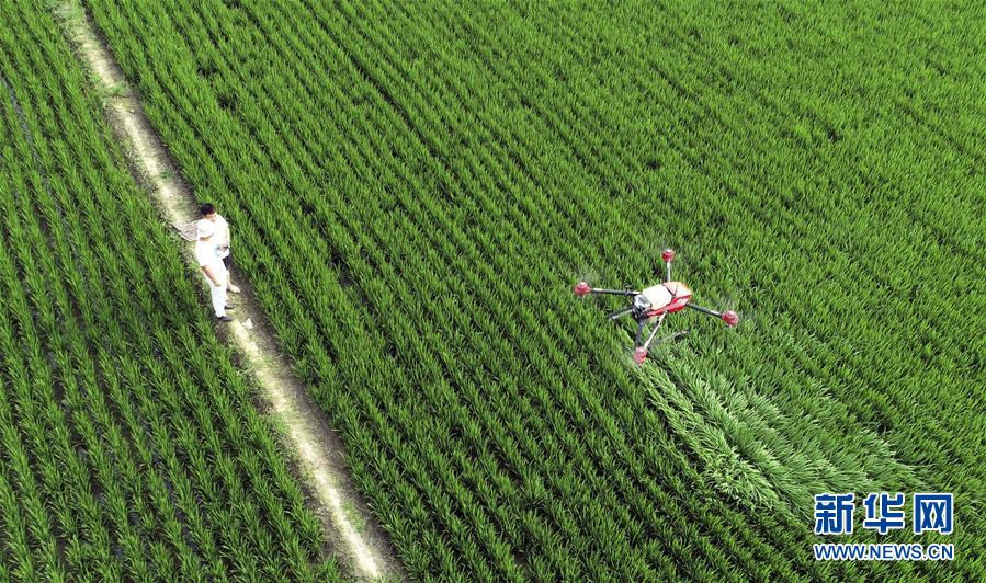 7月30日,在江苏省海安市城东镇丰产村圣大家庭农场,农业植保人员使用无人机对稻田进行管护(无人机航拍)。