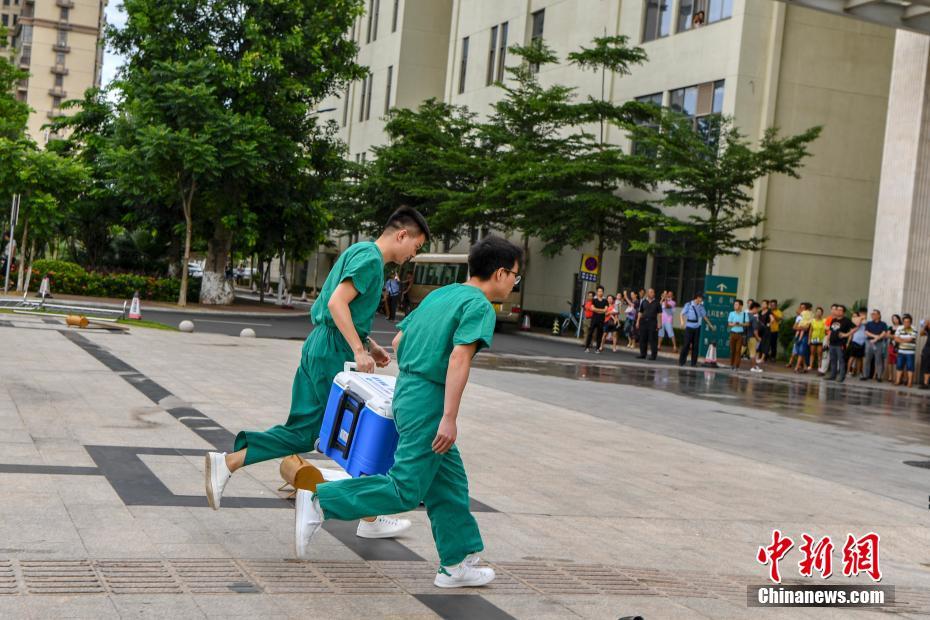 7月31日上午,一架直升飞机降落在海南医学院第二附属医院门诊楼前的停机坪上,两名医务人员护送着捐赠器官快速从直升机上下来,并通过快速通道将器官转运箱运送至手术室。这是该医院作为空中急救联盟医院,首次启用直升机进行器官转运。中新社记者 骆云飞 摄