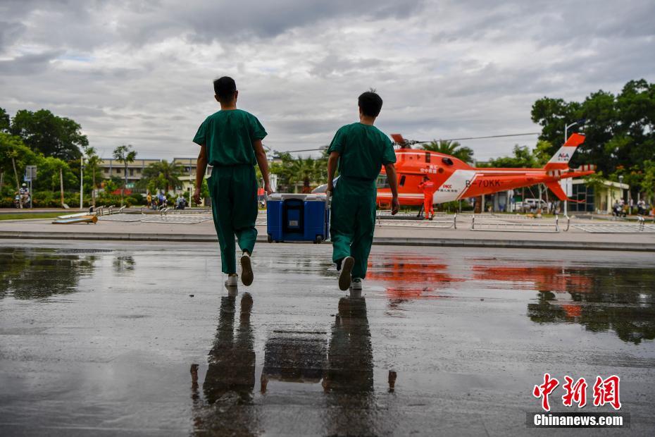 7月31日上午,一架直升飞机降落在海南医学院第二附属医院门诊楼前的停机坪上,两名医务人员护送着捐赠器官快速从直升机上下来,并通过快速通道将器官转运箱运送至手术室。这是该医院作为空中急救联盟医院,首次启用直升机进行器官转运。中新社记者 骆云飞 摄