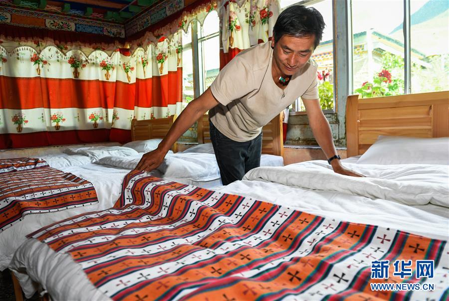 在林芝市朗县洞嘎镇卓村,平措家庭旅馆的老板平措在整理客房(7月26日摄)。 西藏林芝市朗县洞嘎镇卓村是雅鲁藏布江畔的一个小村子。走进绿树掩映的村庄,一座座藏式民房崭新而整洁,57户人家都用上了电视、电脑、WiFi、电冰箱、冲水厕所、太阳能淋浴等用具和设施。这里的藏族群众还都用上了消毒柜,年轻人热衷网购。是什么让这个村落如此“时髦”? 新华社记者 刘东君 摄