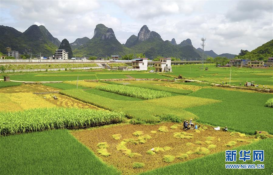 7月31日,在广西柳州市柳江区进德镇乐山村,农民在烈日下抢收早稻(无人机拍摄)。 连日来,广西柳州市柳江区早稻陆续成熟,当地农民冒着酷暑抢收早稻、抢插晚稻。 新华社发(黎寒池 摄)