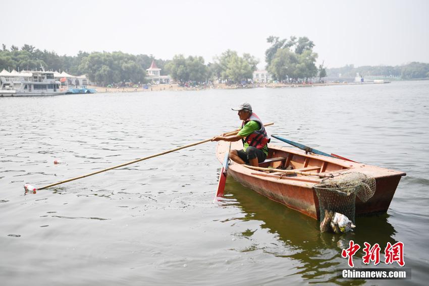 八月的长春市骄阳似火,南湖公园游泳区每日都会有不少人在嬉水乘凉。不远处的湖面上,水上清洁工孙方杰划着船,不时站起身来挥动着长长的打捞竿,弯腰把湖面上的水草和垃圾一一打捞到船里,一身橘红的救生衣格外显眼。