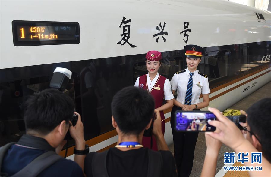 2018年8月1日,10年前首趟京津城际列车的列车长徐颖(右)和列车员李雪倩在北京南站站台上留影。新华社记者 罗晓光 摄