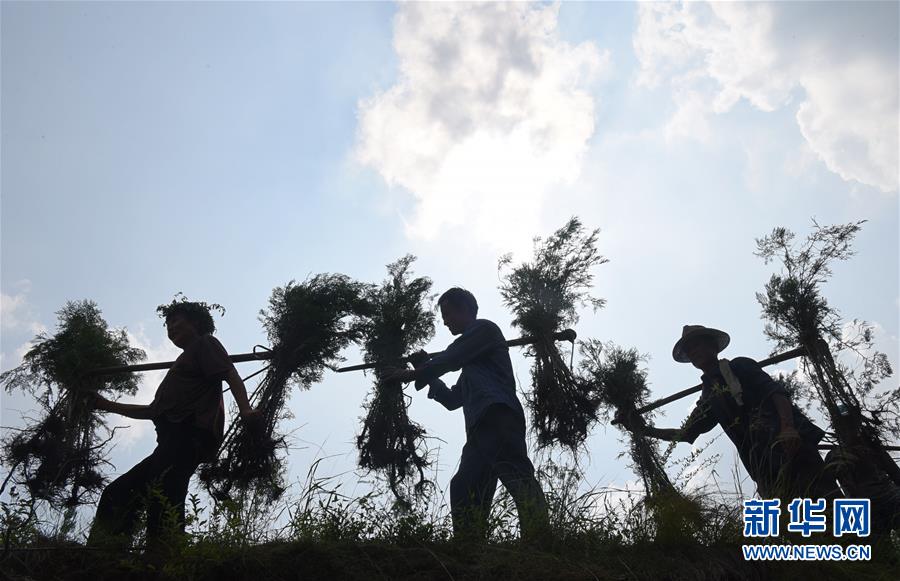 8月1日,在山东省淄博市沂源县石桥镇黑崖村,造林队员挑运树苗上山。