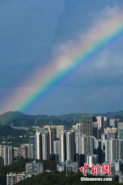 8月1日,一场太阳雨后,贵阳市上空出现彩虹景观,美不胜收。中新社记者 贺俊怡 摄