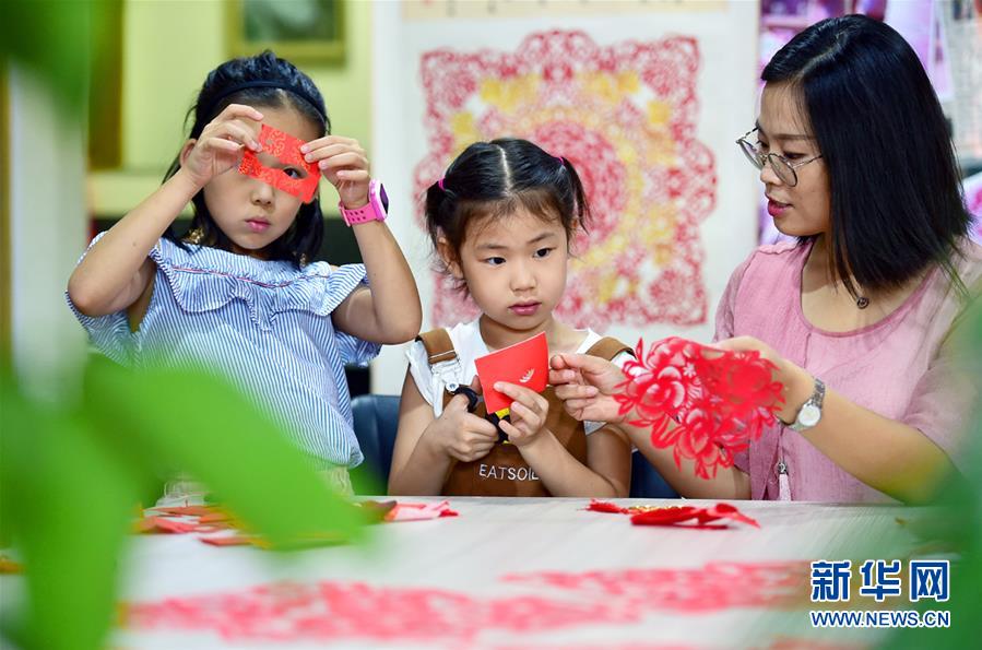8月1日,在石家庄市桥西区谷隆剪纸传习馆里,孩子们跟着老师吕亚琼学习剪纸技法。 新华社发(章朔 摄)