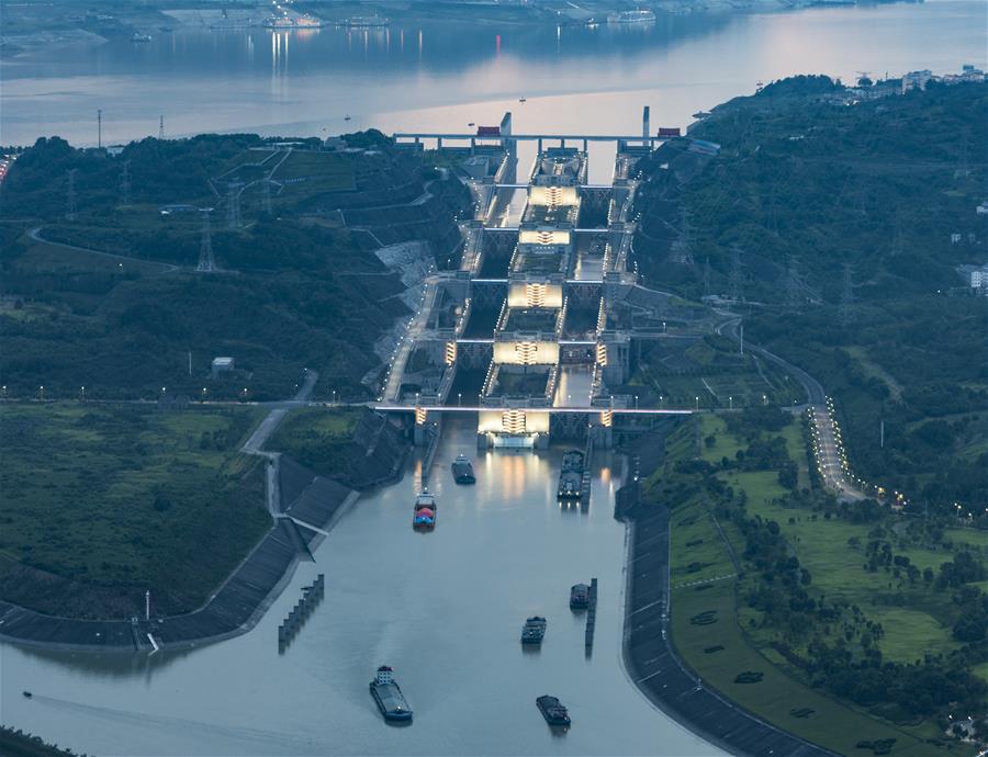 8月1日,船舶有序通过三峡五级船闸。 近日,长江防总抢抓降雨停歇期,精细调度三峡水库减小下泄流量,积极开展航运应急调度,及时疏散三峡江段小功率积压船舶,缓解三峡、葛洲坝两坝间航运压力。8月1日,滞留在三峡江段的待闸船舶基本疏散。 新华社发(郑家裕 摄)