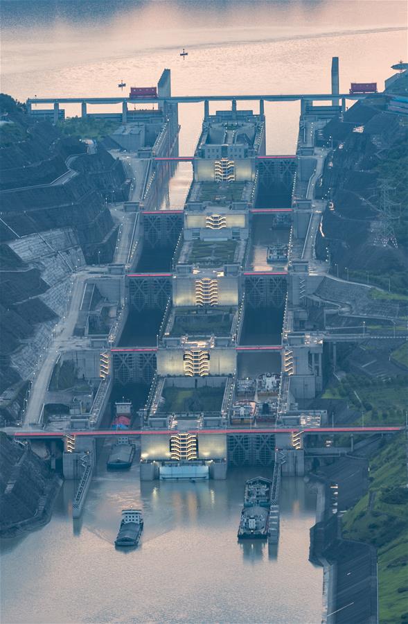 8月1日,船舶有序通过三峡五级船闸。 近日,长江防总抢抓降雨停歇期,精细调度三峡水库减小下泄流量,积极开展航运应急调度,及时疏散三峡江段小功率积压船舶,缓解三峡、葛洲坝两坝间航运压力。8月1日,滞留在三峡江段的待闸船舶基本疏散。 新华社发(郑家裕 摄)