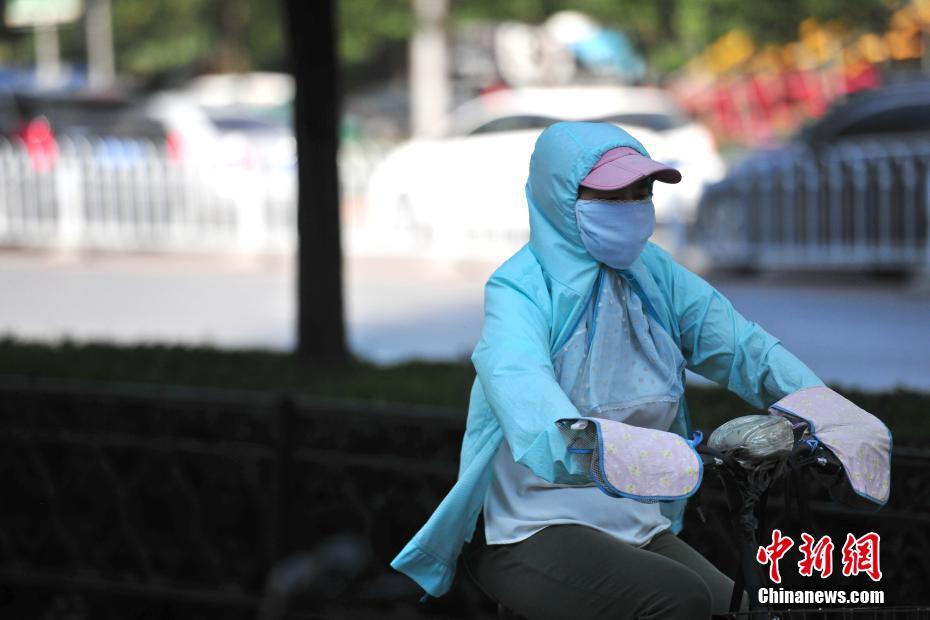 8月2日,一名骑车的市民包裹严实遮阳防晒。当日,沈阳最高气温度达37℃,开启“清蒸模式”。中新社记者 于海洋 摄