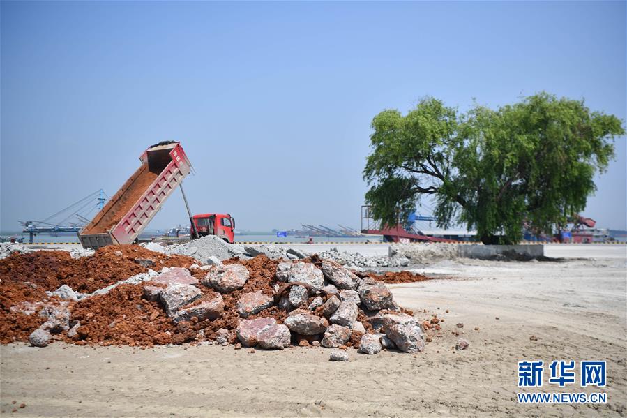 这是7月11日拍摄的整治中的湖南省岳阳市洞庭湖畔的天欣码头。过去,这里是一个砂石中转码头和散货集散地,整治后这片地将会复绿。