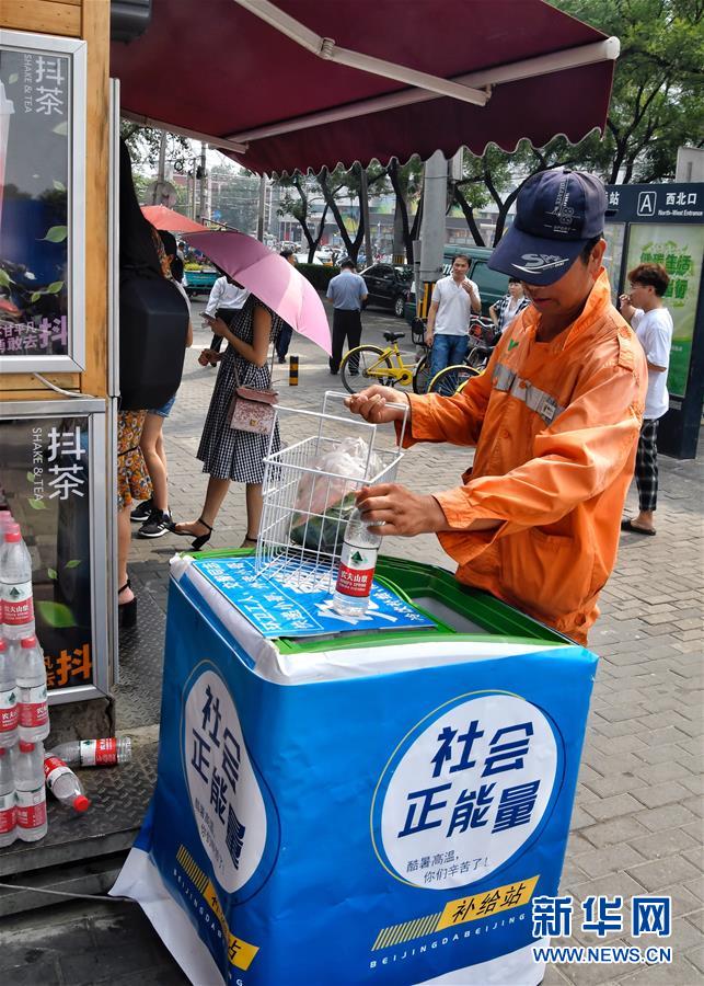 连日来,北京持续高温天气。朝阳区东大桥地铁站附近的一家冷饮店在门口摆出了冰柜,免费为环卫工人、执勤交警、快递员等户外工作者提供冰镇矿泉水和西瓜,附近的市民也会把冷饮和水果放进冰柜供免费取用。 新华社记者 李欣 摄