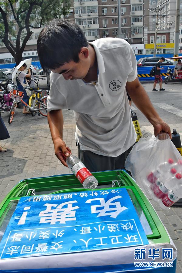 8月2日,冷饮店的工作人员给免费冷饮冰柜里加放矿泉水。