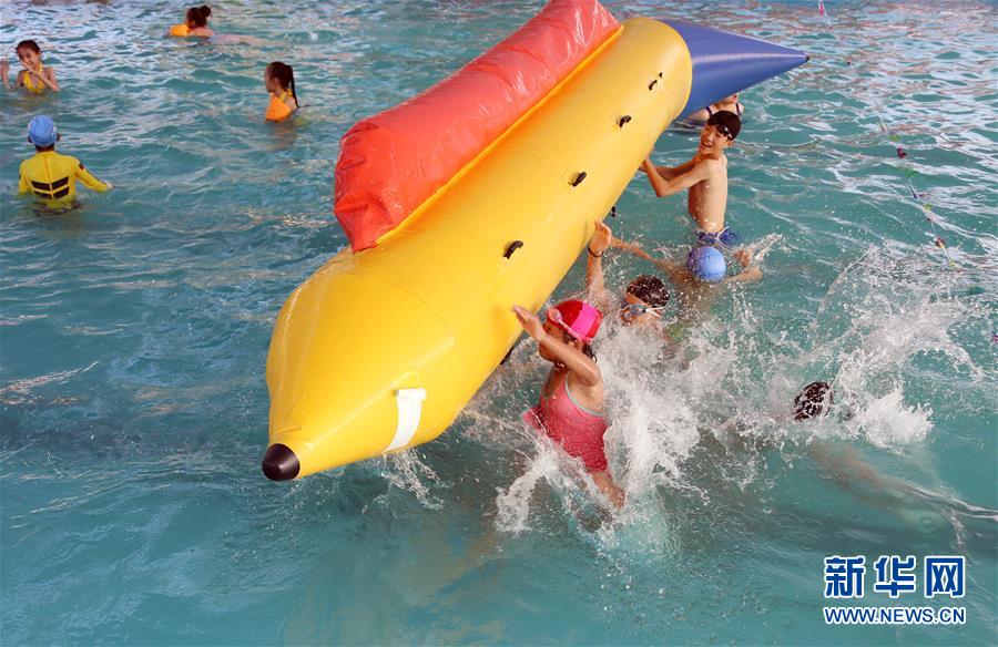 7月21日,小朋友在山东省枣庄市文化广场游泳池内戏水度暑。 暑假期间,许多小朋友以各种各样的方式充实自己的假期。 新华社发(孙中喆 摄)