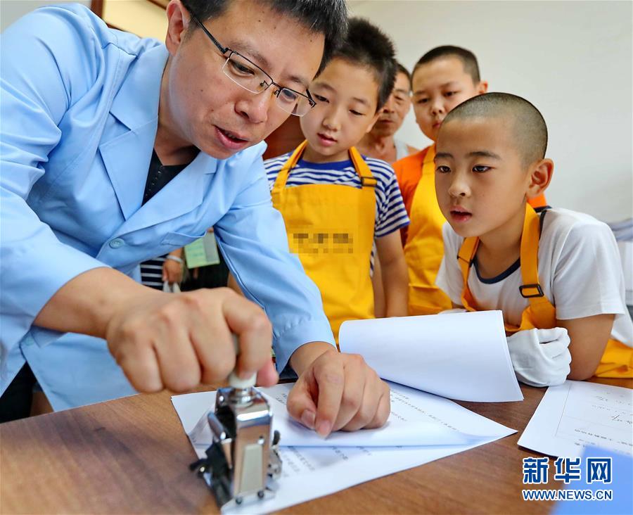 8月2日,河北秦皇岛市档案馆工作人员向前来体验档案文化的海港区红旗里社区的小朋友演示档案处理装订的过程。 暑假期间,许多小朋友以各种各样的方式充实自己的假期。 新华社发(曹建雄 摄)
