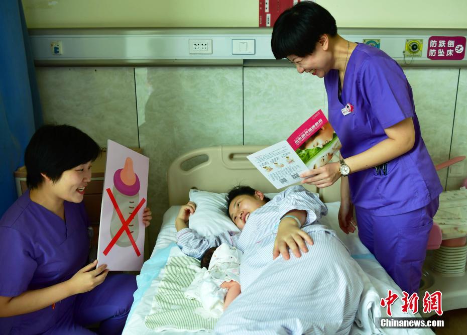 8月3日,世界母乳喂养周期间,医护人员在病房内教宝妈如何对宝宝进行哺乳。河北石家庄市妇产医院举办母乳喂养系列活动,帮助更多的准妈妈、新妈妈学习正确的喂养方式,并鼓励她们“喂”爱坚持。中新社记者 翟羽佳 摄