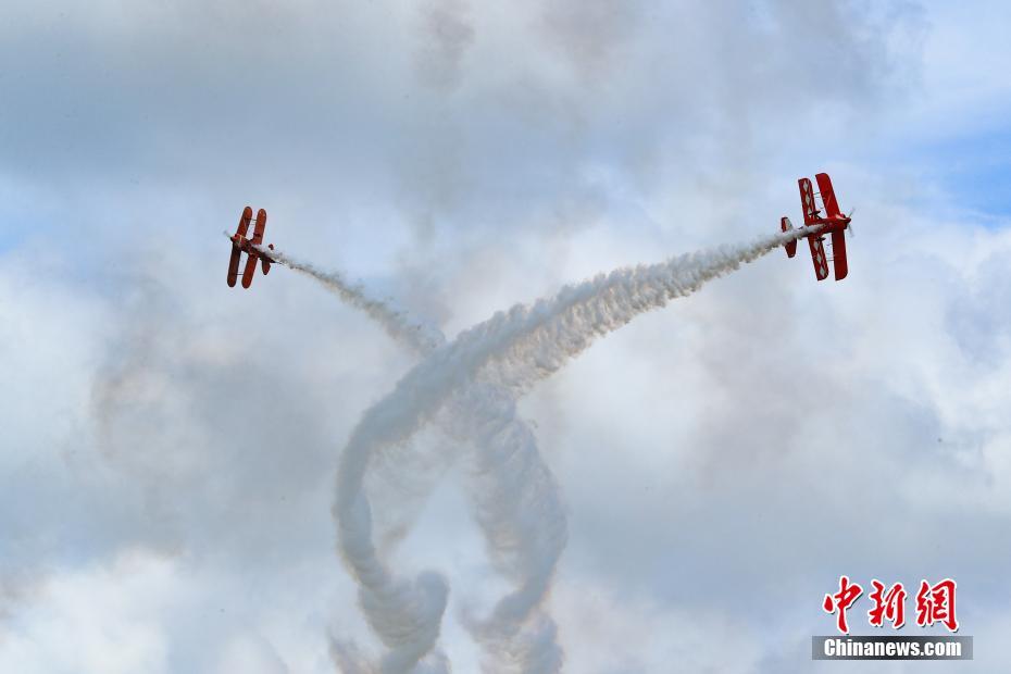 8月3日,贵州安顺,特技飞行表演队在空中表演。当日,主题为“逐梦蓝天·黔程安顺”的2018贵州·安顺黄果树飞行大会正式拉开帷幕。英国御风机翼行走、意大利开拓者、欧洲天空之舞、土耳其战神等世界多支知名特技飞行表演队在贵州安顺黄果树机场上空持续上演空中版“速度与激情”。中新社记者 贺俊怡 摄