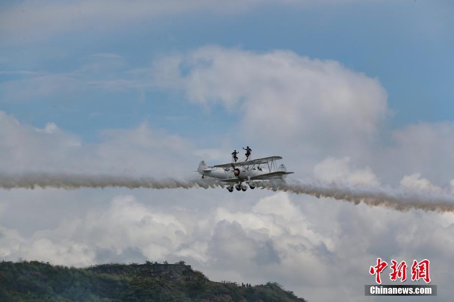 8月3日,贵州安顺,英国御风机翼行走特技飞行表演队空中表演。当日,主题为“逐梦蓝天·黔程安顺”的2018贵州·安顺黄果树飞行大会正式拉开帷幕。英国御风机翼行走、意大利开拓者、欧洲天空之舞、土耳其战神等世界多支知名特技飞行表演队在贵州安顺黄果树机场上空持续上演空中版“速度与激情”。中新社记者 贺俊怡 摄