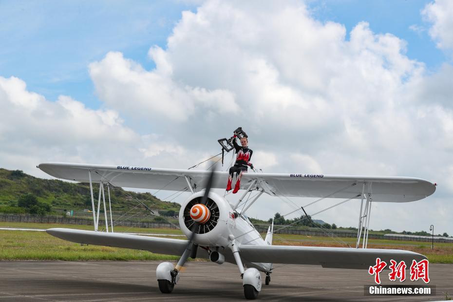8月3日,贵州安顺,英国御风机翼行走特技飞行表演队机翼女郎向观众致意。当日,主题为“逐梦蓝天·黔程安顺”的2018贵州·安顺黄果树飞行大会正式拉开帷幕。英国御风机翼行走、意大利开拓者、欧洲天空之舞、土耳其战神等世界多支知名特技飞行表演队在贵州安顺黄果树机场上空持续上演空中版“速度与激情”。中新社记者 贺俊怡 摄